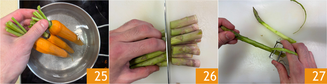 Kochen Sie die Karotten etwa 10 Minuten in Salzwasser 25. Jetzt kümmern Sie sich um das Wie man Spargel putzt: Entfernen Sie den holzigeren Teil 26, schälen Sie die Stängel 27 und lassen Sie die Spitzen intakt.