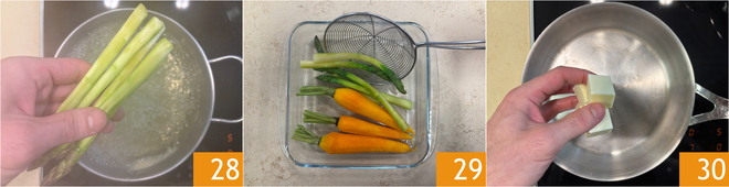 Kochen Sie auch den Spargel im kochenden Salzwasser für 2-3 Minuten 28. Die Gemüse abgießen 29 und die Butter in einer heißen Pfanne schmelzen 30.