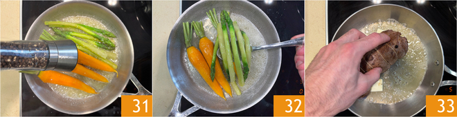 Legen Sie die Gemüse in die Pfanne und würzen Sie mit Salz und Pfeffer 31. Kochen Sie bei starker Hitze für ein paar Minuten, dann entfernen Sie den Spargel aus der Pfanne 32 und braten Sie die Karotten weitere 2 Minuten an. Beiseite stellen. Zu diesem Zeitpunkt den Braten in der Pfanne erneut erhitzen: 50 g Butter schmelzen und den Braten hinzufügen 33. Auf jeder Seite eine Minute bei starker Hitze anbraten.