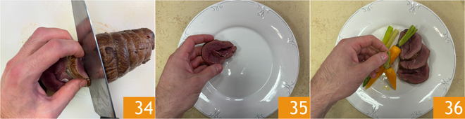 Alles ist bereit zum Anrichten: Schneiden Sie das Fleisch in Scheiben 34, legen Sie sie auf den Teller 35 und fügen Sie das Gemüse hinzu 36.