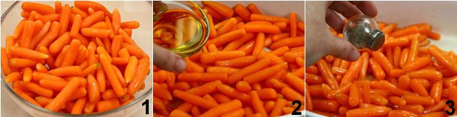 Um die Honigkarotten zuzubereiten, beginnen Sie damit, 600 g Babykarotten zu waschen 1. Legen Sie sie dann in eine Ofenform, würzen Sie sie mit extra nativem Olivenöl 2, salzen Sie kräftig und pfeffern Sie 3. Stellen Sie die Form bei 190°C für 20 Minuten in den Ofen.