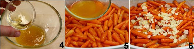 Nach dieser Zeit nehmen Sie die Karotten aus dem Ofen, mischen Sie in einer Schüssel den Honig mit dem weißen Weinessig 4 und würzen Sie die Karotten mit der erhaltenen Mischung 5. Stellen Sie die Form wieder in den Ofen und garen Sie die Karotten für weitere 30 Minuten. Die Karotten sollten gar, aber noch ziemlich knackig sein. Nehmen Sie die Form aus dem Ofen, fügen Sie die Mandelblättchen hinzu 6, eventuell noch eine weitere Prise schwarzer Pfeffer und servieren Sie die Honigkarotten heiß.