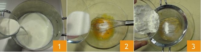 Um den Honigkuchen zuzubereiten, beginnen Sie mit der Konditorcreme: Erhitzen Sie die Milch in einem Topf 1, schlagen Sie in einer separaten Schüssel die Eigelbe mit dem Zucker mit einem Schneebesen 2, dann fügen Sie die gesiebte Stärke hinzu, sobald eine homogene Mischung erreicht ist 3.