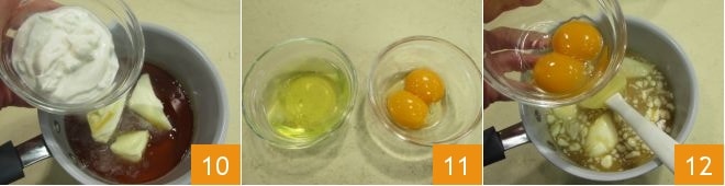 und das Joghurt 10. Trennen Sie die Eiweiße von den Eigelben 11 und fügen Sie letztere der Honigmischung hinzu 12.