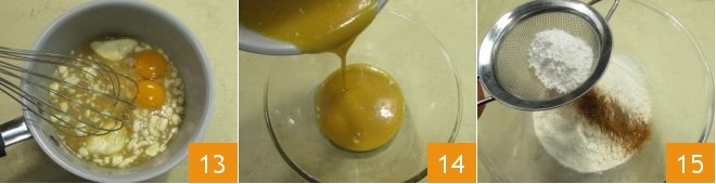 Rühren Sie mit dem Schneebesen 13 bis Sie eine homogene Mischung erhalten, die Sie in eine Schüssel geben 14. Sieben Sie nun das Mehl, die Speisestärke, den Zimt und das Backpulver separat 15.