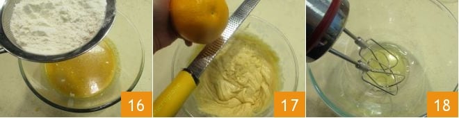 Fügen Sie die Pulver der Honigmischung hinzu 16 und mischen Sie, um es zu vermengen, aromatisieren Sie mit der geriebenen Orangenschale 17 und stellen Sie es beiseite. Heizen Sie den Ofen auf 200° im statischen Modus vor, dann nehmen Sie die beiseitegelegten Eiweiße und schlagen Sie sie mit einem elektrischen Schneebesen steif 18, bis sie schön schaumig sind,