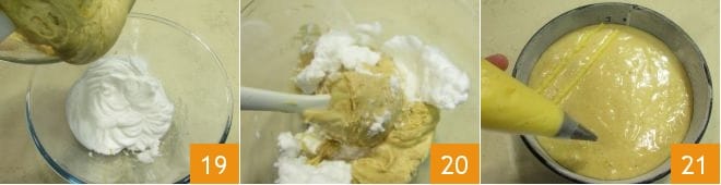 dann fügen Sie den Teig zu den geschlagenen Eiweißen hinzu 19 und rühren Sie vorsichtig mit einem Spatel von unten nach oben 20, bis Sie eine homogene Mischung erhalten. Fetten und mehlen Sie eine Form mit 22 cm Durchmesser ein und füllen Sie sie mit dem Teig, dann nehmen Sie die Konditorcreme und geben Sie sie in einen Spritzbeutel mit glatter Tülle. Ziehen Sie mit der Creme Linien über die Oberfläche des Kuchens 21,