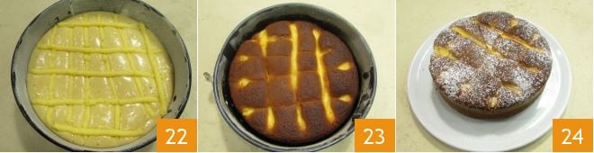 um ein Gitter zu bilden 22. Jetzt können Sie den Honigkuchen im vorgeheizten statischen Ofen bei 200° für 40 Minuten backen. Nach dem Backen nehmen Sie Ihren Kuchen aus dem Ofen, lassen ihn abkühlen 23, dann stürzen Sie ihn aus der Form und bestäuben die Oberfläche vor dem Servieren mit Puderzucker 24.