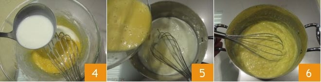 Verdünnen Sie die Eimischung mit einer Kelle heißer Milch 4, dann geben Sie die erhaltene Mischung in den Topf mit der restlichen Milch 5 und bringen Sie sie wieder auf den Herd. Lassen Sie die Creme bei niedriger Hitze eindicken und rühren Sie dabei mit dem Schneebesen. Sobald die Creme ausreichend dick ist 6,