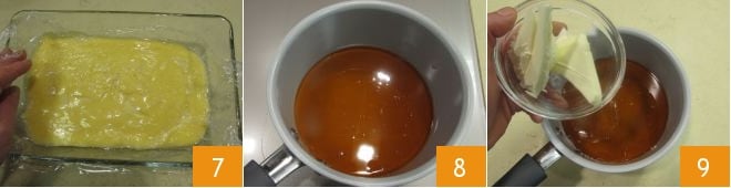 nehmen Sie sie vom Herd und geben Sie sie in eine Schüssel, decken Sie sie mit Frischhaltefolie ab und lassen Sie sie abkühlen 7. Sobald die Creme Raumtemperatur erreicht hat, können Sie sie im Kühlschrank fest werden lassen. Jetzt kümmern Sie sich um den Kuchenteig: Erwärmen Sie den Honig leicht in einem Topf 8, dann nehmen Sie ihn vom Herd und fügen die Butter hinzu 9