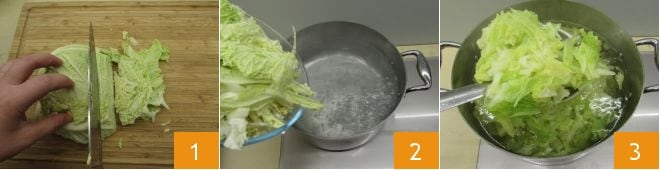 Um die Hülsenfruchtpasta mit Wirsing- und Haselnusspesto zuzubereiten, beginnen Sie mit dem Pesto. Entfernen Sie die äußeren Blätter des Wirsings und den mittleren Teil, dann hacken Sie ihn grob 1. Spülen Sie den Wirsing gründlich unter Wasser ab und tauchen Sie ihn in einen Topf mit kochendem Salzwasser 2. Kochen Sie den Wirsing etwa 10 Minuten lang und schöpfen Sie ihn mit einem Schaumlöffel ab 3.