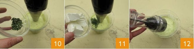 Die abgezupften Thymianblätter 10 und die Robiola 11. Würzen Sie schließlich mit Pfeffer und eventuell Salz 12.