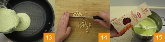 Übertragen Sie die Mischung in einen Topf 13 und zerhacken Sie die restlichen Haselnüsse 14. Währenddessen kochen Sie die Pasta im Kochwasser des Wirsings: so nimmt sie mehr Geschmack auf 15.