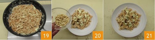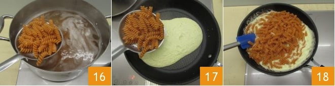 Sobald die Fusilli al dente sind, schöpfen Sie sie ab 16 und geben Sie sie in die Pfanne mit dem Pesto, bei ausgeschalteter Flamme 17. Rühren Sie mit einem Spatel um, und fügen Sie bei Bedarf etwas Kochwasser der Pasta hinzu, um die Sauce zu verdünnen 18.