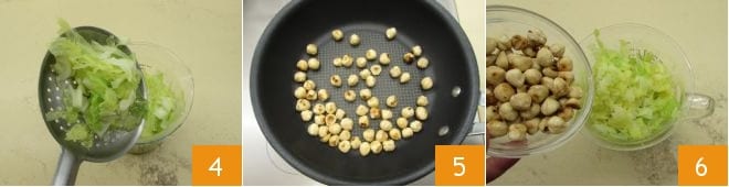 Übertragen Sie die Blätter in den Behälter eines Mixers 4. Bewahren Sie das Kochwasser des Wirsings auf, das Sie zum Kochen der Pasta benötigen. Während der Wirsing kocht, rösten Sie die Haselnüsse in einer Pfanne bei starker Hitze, indem Sie sie häufig wenden und darauf achten, dass sie nicht verbrennen 5. Geben Sie nur die Hälfte der Haselnüsse zu den blanchierten Wirsingblättern 6.