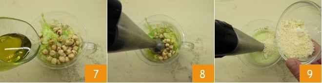 Gießen Sie das Öl hinzu 7 und beginnen Sie zu mixen 8. Fügen Sie nach und nach auch den Rest der Zutaten hinzu: den geriebenen Parmesankäse 9.