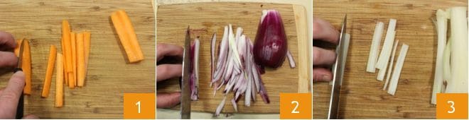 Um das Huhn in Carpione zuzubereiten, beginnen Sie damit, die Karotte zu schälen, und schneiden Sie sie dann der Länge nach in dünne Streifen 1. Nehmen Sie die Zwiebel, schälen Sie sie und halbieren Sie sie, legen Sie dann die flache Seite einer Hälfte auf ein Schneidebrett und schneiden Sie sie der Länge nach 2. Waschen Sie den Stangensellerie gut unter fließendem Wasser und entfernen Sie die äußeren Blätter, die seitlichen und die oberen. Entfernen Sie die äußere faserige Membran mit dem Sparschäler. Halbieren Sie den Stiel und schneiden Sie ihn in viele dünne Streifen 3.