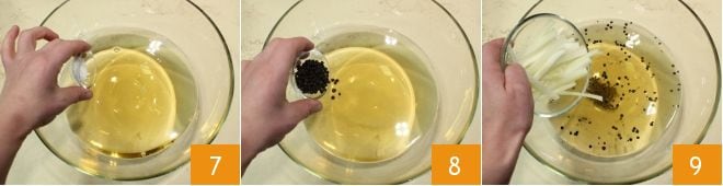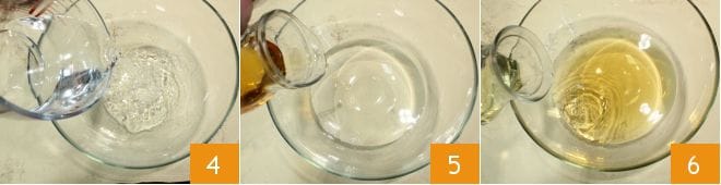 Bereiten Sie die Marinade vor: Geben Sie in eine große Schüssel Wasser 4, Weißweinessig 5 und trockenen Weißwein 6,