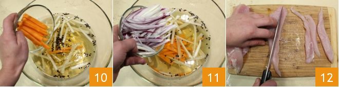 die Karotte 10 und die Zwiebel 11, mischen Sie mit einem Holzlöffel, um die Zutaten zu würzen. Jetzt kümmern Sie sich um das Fleisch: Schneiden Sie die Hühnerbrust in etwa 1,5 cm dicke Stäbchen 12.