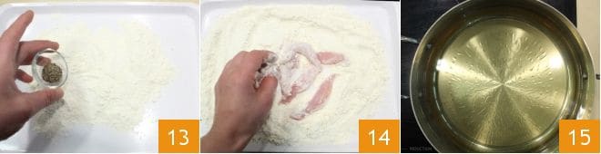Legen Sie eine Schicht Mehl auf ein Tablett, salzen und pfeffern Sie 13, und mehlieren Sie die Hühnerstäbchen so, dass sie vollständig bedeckt sind 14. Stellen Sie nun einen hohen Topf auf den Herd, der zum Frittieren geeignet ist, gießen Sie das Pflanzenöl hinein 15 und erhitzen Sie es, es sollte eine Temperatur von etwa 170° erreichen. Wenn Sie kein Küchenthermometer haben, um die Öltemperatur zu überprüfen, krümeln Sie etwas Mehl in den Topf, bevor Sie die Hühnerflügel hineingeben: Wenn es zischt, ist das Öl heiß genug zum Frittieren.