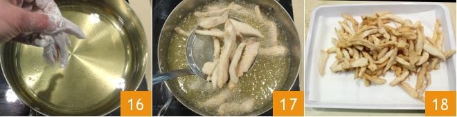Frittieren Sie die Hühnerstreifen, wenige auf einmal, für ein paar Minuten, bis sie leicht goldbraun sind 16. Heben Sie sie mit einem Schaumlöffel heraus 17 und lassen Sie sie auf einem mit Küchenpapier ausgelegten Tablett abtropfen 18.