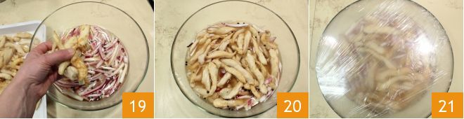 Lassen Sie die Hühnerstäbchen abkühlen und legen Sie sie dann in die Marinade (19-20), bedecken Sie die Schüssel mit Frischhaltefolie 21. Lassen Sie sie über Nacht ruhen und servieren Sie sie dann im selben Gefäß.