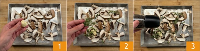 Um den Pilzhummus zuzubereiten, reinigen Sie zuerst die Pilze mit einem feuchten Tuch von Erdresten. Schneiden Sie sie grob in Scheiben und dann in Hälften. Legen Sie sie in eine Backform und fügen Sie Knoblauch 1, Majoran, Thymian 2, Salz und Pfeffer 3 hinzu.