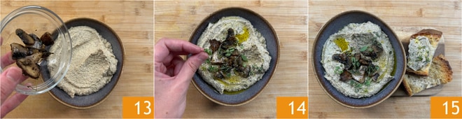 Geben Sie alles in eine Schüssel und dekorieren Sie mit den zurückbehaltenen Pilzen 13. Fügen Sie Pfeffer, einen Spritzer Öl, einige Thymian- und Majoranblätter hinzu 14. Ihr Pilzhummus ist servierfertig, vielleicht begleitet von gerösteten Brotscheiben 15.