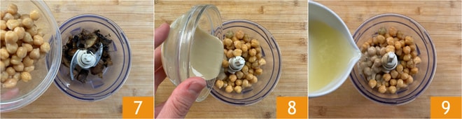 Legen Sie die Pilze in den Mixer und behalten Sie einen Esslöffel davon für die endgültige Dekoration zurück. Fügen Sie die Kichererbsen 7, Tahini 8 und Zitronensaft 9 hinzu.