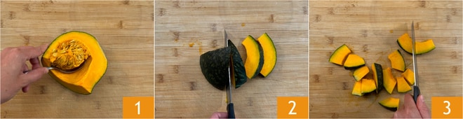 Um den Kürbishummus zuzubereiten, entfernen Sie zuerst die Kerne und das Innere des Kürbisses 1. Schneiden Sie ihn in 1-2 cm dicke Scheiben 2 und dann die Scheiben in Hälften 3. Es ist wichtig, dass sie gleich groß sind, um eine gleichmäßige Garzeit zu erreichen.
