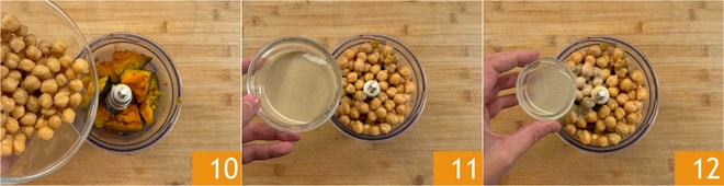 Geben Sie den Kürbis in einen Mixer und fügen Sie die Kichererbsen 10, Tahini 11 und Zitronensaft 12 hinzu.