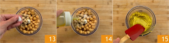Würzen Sie mit einer Prise Salz 13 und einem ordentlichen Schuss Öl 14. Mixen Sie, bis Sie eine homogene, glatte und butterartige Konsistenz 15 erreichen. Sollte die Mischung zu dick sein, können Sie etwas Wasser oder einen Eiswürfel hinzufügen und einige Sekunden lang mixen.