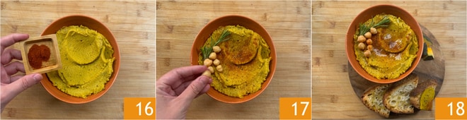 Übertragen Sie alles in eine Schüssel und garnieren Sie mit Paprika 16, Pfeffer, Rosmarin, Kichererbsen 17 und einem Spritzer Öl. Ihr Kürbishummus ist bereit zum Genießen 18, vielleicht zusammen mit geröstetem Brot.
