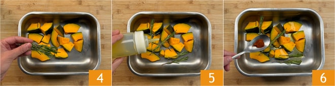 Übertragen Sie alles in eine Auflaufform und würzen Sie es mit Rosmarin 4, Öl 5 und Paprika 6.