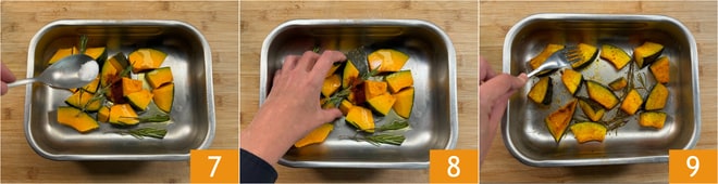 Fügen Sie Salz hinzu 7 und massieren Sie die Kürbisstücke 8, um sie gleichmäßig zu würzen. Backen Sie sie im statischen Ofen bei 200°C für 30 Minuten. Überprüfen Sie mit einer Gabel, ob der Kürbis weich geworden ist 9.