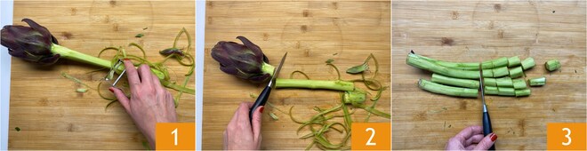 Um den Hummus mit Artischockenstielen zuzubereiten, beginnen Sie mit der Wie man Artischocken putzt. Entfernen Sie mit einem Sparschäler den äußeren Teil, der bitter schmecken würde 1. Falls die Artischocke noch vorhanden ist, schneiden Sie sie ab 2 und bewahren Sie sie für Ihre Rezepte auf. Schneiden Sie die Artischockenstiele in Stücke 3.