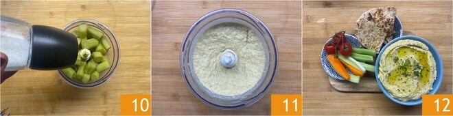 Fügen Sie das Salz hinzu 10 und pürieren Sie mehrmals, bis Sie eine glatte Creme erhalten 11. Geben Sie den Hummus in eine Schüssel, würzen Sie mit Öl und Minzblättern 12.