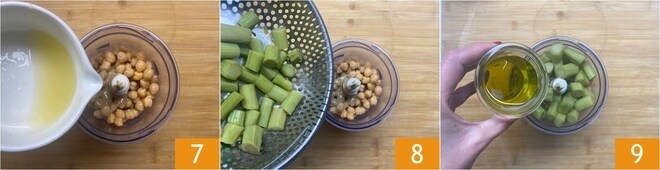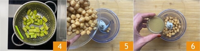 Kochen Sie sie oder dämpfen Sie sie, bis sie zart sind 4. Geben Sie die Kichererbsen in den Behälter eines Mixers 5, fügen Sie die Tahini 6 und, wenn Sie möchten, den Knoblauch hinzu, indem Sie ihn entkernen.