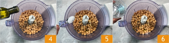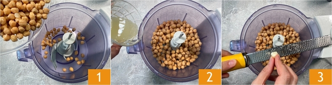 Um den Hummus ohne Tahina zuzubereiten, geben Sie die abgetropften vorgekochten Kichererbsen in einen Mixer 1, dann fügen Sie den Zitronensaft hinzu 2 und reiben eine Knoblauchzehe hinein 3.