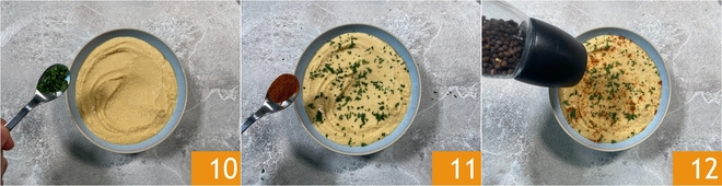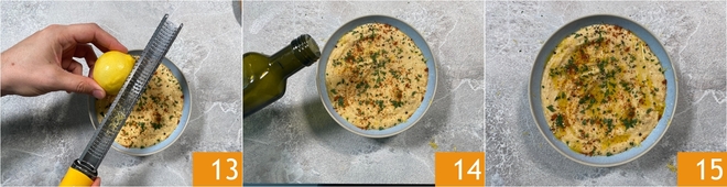 Verfeinern Sie mit Zitronenschale 13 und beenden Sie mit einem Schuss Öl 14. Ihr Hummus ohne Tahina ist fertig zum Servieren 15!