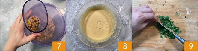 Schließen Sie den Mixer 7 und pürieren Sie, bis eine cremige Konsistenz erreicht ist 8. Sollte es noch klumpig sein, fügen Sie nach und nach etwas Wasser hinzu. Nun kümmern Sie sich um die Dekoration: hacken Sie die Petersilie fein 9.