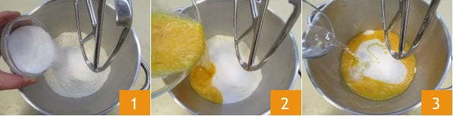 Um die Chiacchiere im Ofen vorzubereiten, beginnen Sie damit, in einer Küchenmaschine mit Rührblatt das gesiebte Mehl zusammen mit dem Backpulver zu geben. Dann den Zucker 1, eine Prise Salz, die ganzen Eier und das leicht geschlagene Eigelb 2 hinzufügen. Geben Sie auch den Grappa hinzu 3 und bearbeiten Sie den Teig bei mittlerer Geschwindigkeit, bis die Zutaten gut vermischt sind.