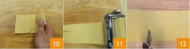 Falten Sie die kurzen Seiten zur Mitte hin 10 und lassen Sie den Teig wieder durch die Nudelmaschine bei immer dünnerer Dicke laufen, bis Sie einen sehr dünnen Teig haben 11. Lassen Sie die Teigstreifen ein paar Minuten ruhen, dann können Sie sie mit einem gezackten Teigrad ausgleichen und Rechtecke von etwa 10x6 cm 12 schneiden.