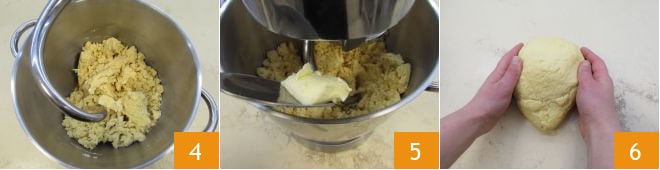 Ersetzen Sie das Rührblatt durch den Knethaken 4 und fahren Sie fort, indem Sie die Samen der Vanilleschote und die bei Raumtemperatur weich gewordene Butter 5 hinzufügen. Kneten Sie weitere 10 Minuten, bis Sie eine feste, aber geschmeidige Konsistenz erhalten. Übertragen Sie den Teig auf die Arbeitsfläche und formen Sie ihn zu einer Kugel 6.
