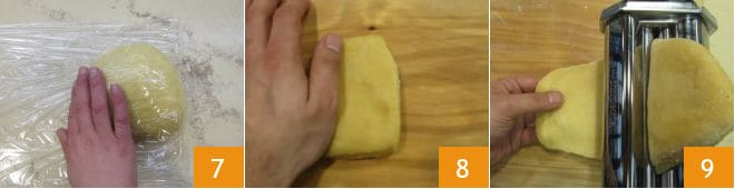 Wickeln Sie den Teigball in Frischhaltefolie 7 und lassen Sie ihn 30 Minuten bei Raumtemperatur ruhen. Nehmen Sie dann ein Stück Teig und lassen Sie den Rest abgedeckt; drücken Sie es mit der Handfläche flach 8, leicht bemehlen und dann durch die Nudelmaschine bei der anfänglich breitesten Dicke laufen lassen 9.