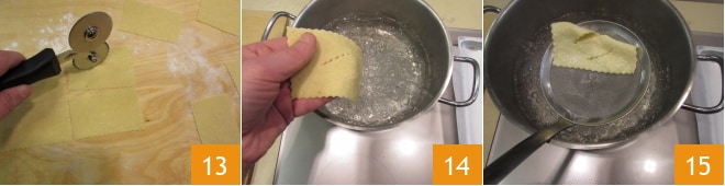 Schneiden Sie in jedes Rechteck schräge Einschnitte in der Mitte 13. Jetzt sind Sie bereit, die Chiacchiere ein paar Sekunden in einem Topf mit kochendem Wasser zu blanchieren 14, bis sie wieder an die Oberfläche kommen; nicht mehr als 1-2 Chiacchiere gleichzeitig kochen. Dann abtropfen lassen 15