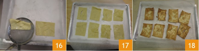 und auf ein mit Backpapier belegtes Backblech legen 16. Fahren Sie auf diese Weise fort, bis das erste Blech gefüllt ist 17. Backen Sie in einem vorgeheizten Umluftofen bei 200°C etwa 5 Minuten auf der einen Seite und 5 Minuten auf der anderen. Wenn sie fertig sind, aus dem Ofen nehmen und abkühlen lassen 18.