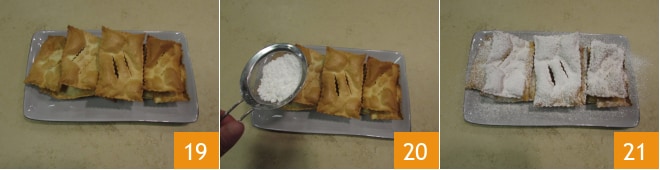 Übertragen Sie die Chiacchiere auf eine Servierplatte 19 und bestäuben Sie mit Puderzucker 20. Ihre Chiacchiere aus dem Ofen sind bereit, genossen zu werden 21!
