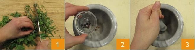 Um die im Ofen gebackenen Hähnchenschenkel mit Äpfeln zuzubereiten, beginnen Sie damit, die Kräuter fein zu hacken, also die Petersilie, den Salbei, den Rosmarin und den Thymian 1, und stellen Sie sie beiseite. Geben Sie die schwarzen, weißen und rosa Pfefferkörner und die Wacholderbeeren in einen Mörser 2 und zerstoßen Sie sie mit dem Stößel 3