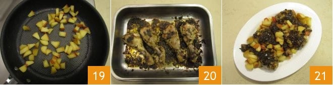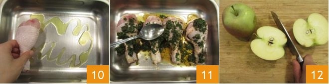 Nehmen Sie eine Auflaufform und fetten Sie den Boden mit Olivenöl ein, legen Sie dann die Hähnchenschenkel nebeneinander hinein 10, und bedecken Sie sie mit der zuvor zubereiteten Gewürzmischung 11. Backen Sie die Schenkel im vorgeheizten statischen Ofen bei 180° für 45 Minuten. In der Zwischenzeit waschen und trocknen Sie die Äpfel, schneiden Sie sie erst in Hälften 12